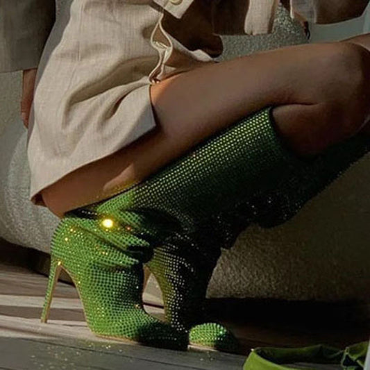 Pointed Toe Cashmere Solid Color Women's Rhinestone Stiletto High Heel Knee Boots
